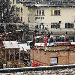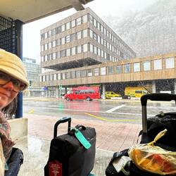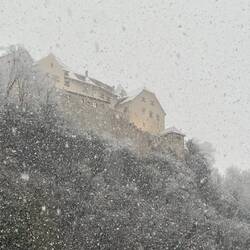 It was perfectly fitting — almost scripted — that when I woke up early and opened the hotel curtains, soft snow was drifting around the Vaduz Castle. Our time in Liechtenstein now officially had all the elements of a Hallmark movie: a tiny alpine capital, Christmas decorations going up, and now a light snowfall over the castle on the hill. I headed downstairs for a cappuccino and some blogging while Donna caught a little more sleep. Today was a travel day, and we needed the energy.