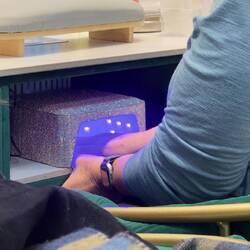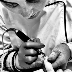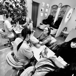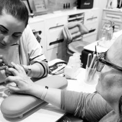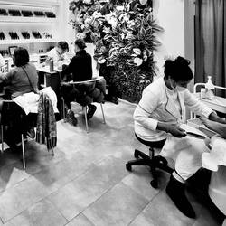 While Donna settled in, I lingered outside taking photos through the window — part street photographer, part husband smart enough not to interrupt a woman in her beauty-zone. Inside, Donna was at the manicure table having what looked like a Formula 1 pit crew session on her fingertips. The precision! The teamwork!