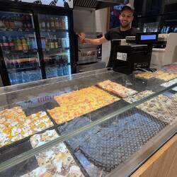 Our Airbnb host pointed us toward a local pizza place just a couple of blocks away. Easy mission. We followed our stomachs straight to Alice’s Pizza — a fast-food style franchise we later spotted all over the city. But let me say this clearly: this was not your typical franchise disappointment. This was, “Wow… why is this so good?” pizza. The crust was thin and firm, the bread had this wonderful almost-but-not-quite-explainable flavor, and the sauce and toppings fused into something far better than two exhausted travelers deserved.