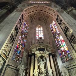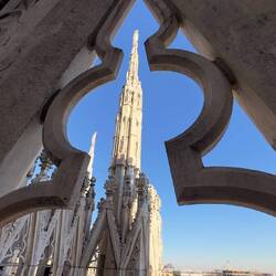 Inside and out, the Duomo di Milano was breathtaking. No photograph can prepare you for it. The façade rises like a forest of marble spires, each carved with impossible detail. Our guide explained how construction began in the 1300s and continued for centuries, which suddenly made sense as we walked beneath towering stained glass and past sculptures tucked into every niche. The entire structure feels alive — ancient yet somehow always becoming.