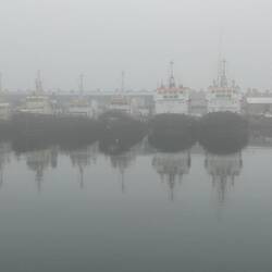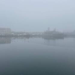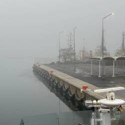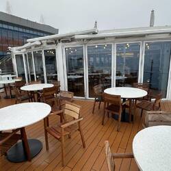 I finally got my hot chocolate and found a cozy table in the lounge — the perfect spot to start catching up on our FindPenguins posts. Outside, a soft fog lingers over the harbor, giving everything a peaceful, dreamlike feel.