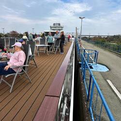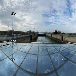 At one point, I looked over to see a small herd of sheep being guided down a narrow road that runs parallel to the canal — a quiet moment of rural life framed perfectly against this marvel of modern engineering. As the lock filled, we rose higher and higher until, from the top deck, we were suddenly above the land beside us.