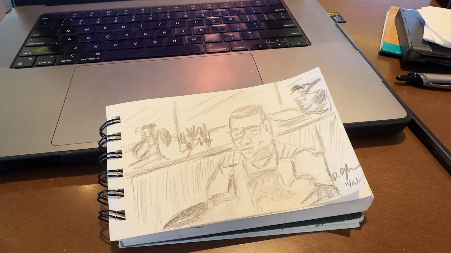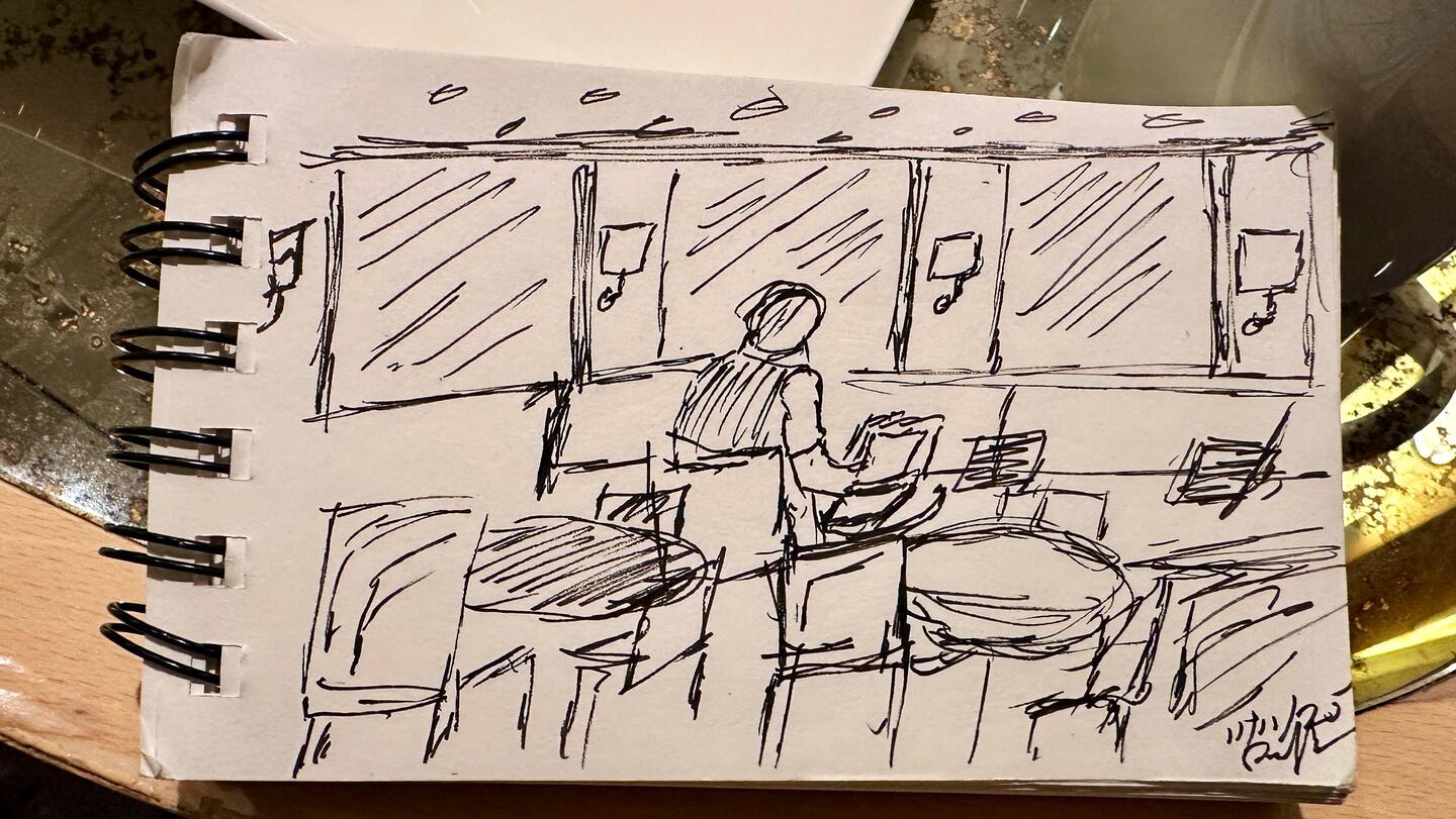 For the first time in days, I found myself alone with my thoughts. I opened my small sketchbook and began a quick pen and ink drawing of what I was seeing, what I was feeling. The quiet, the movement of the ship, the subtle hum of the engines — it all felt like meditation.