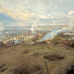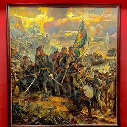 It feels like stepping straight into 1877 — not in a violent way, but in a way that lets you feel the intensity, the bravery, and the cost. The brushwork is dramatic, full of motion and emotion. Faces of soldiers blur into smoke; sunlight breaks through clouds and highlights the chaos; and in the distance, you see the moment when the tide turned and the siege finally broke.