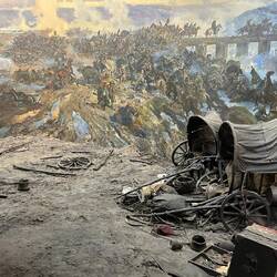You walk up the ramp, turn the corner… and suddenly you’re surrounded by a 360-degree battlefield painting over 300 feet long. It’s not just a painting — it’s a full immersion. The floor blends seamlessly into the canvas with real soil, broken wagon wheels, sandbags, rifles, grass, and trenches that merge with the painted world. The lighting shifts as you walk, and the soundtrack of distant cannon fire and horses pulls you deeper in.