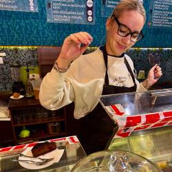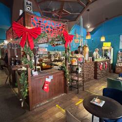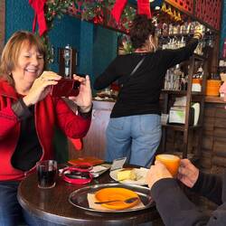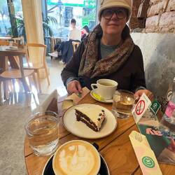 The young man and woman behind the counter were warm and welcoming. I ordered a cappuccino; Donna had tea. We shared a slice of rich chocolate cake that felt like it had been waiting just for us.