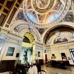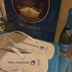 Today we ventured out on our own to Széchenyi, the famous thermal bath house in Budapest. Donna wasn’t too keen on the idea of “just sitting in a hot tub,” but she humored me for this one. We called an Uber, and about fifteen minutes later we pulled up to this enormous yellow palace of a place.
