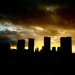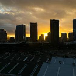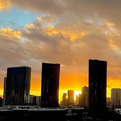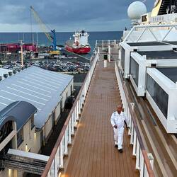 It’s almost sunrise - a bit before 7:00 AM - I climb up one level to deck 9 - the Sports Deck to get an unencumbered view of the city and sunrise. It’s warm out in the 70’s.