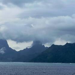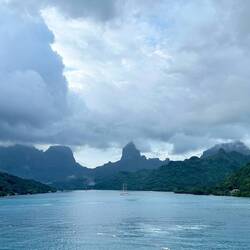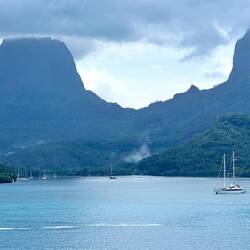 The skies were not colorful at 5:55 — However, as the captain guided the Neptune to anchor this morning in Opunohu Bay, the breeze was refreshing and the views awakening.