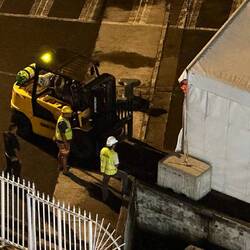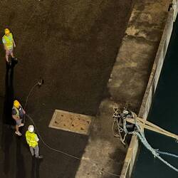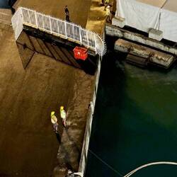 We watch the shore line men pull in the lines and attached them to the posts on the pier. However, the furthest line had issues. The angle of the line from the ship to the post was blocked by a huge jersey barrier (cement block) which they then got a fork light and pushed it out of the way.