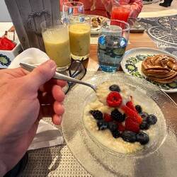 We have an early private all day excursion. We grab a quick breakfast of oatmeal, brown sugar,and fruit along with a heated cinnamon roll.
