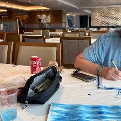 Today we rushed through a quick breakfast at the World Cafe. Here are some pics of the view from our floating dinning room window, along with today’s breakfast. Got to our 10:00 AM art class at 9:40 - chairs are already filling up - the paint is already flying in the air, as people get caught up with uncompleted projects. Today, we start our Sea Turtle project.