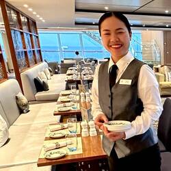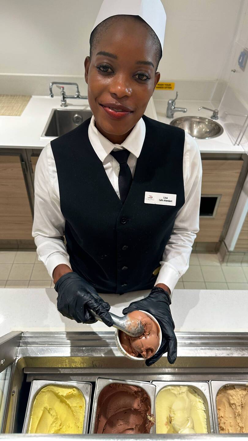 Lisa has the BEST job onboard the Neptune - It’s even more important than my favorite bartender’s job. - Lisa is the “Ice Cream Lady” at the World Cafe. She serves gelato & sorbet to an often line of wanting passengers.