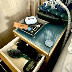 The is a photo of my nightstand - Donna got us both little travel trays which have our names on it, a map, and the name and date of our cruise. It folds flat when in the suitcase, and is really helpful for organizing “the stuff” we carry in our pockets when we go to bed.