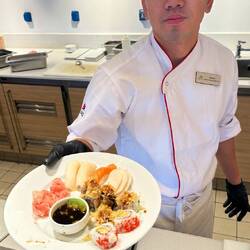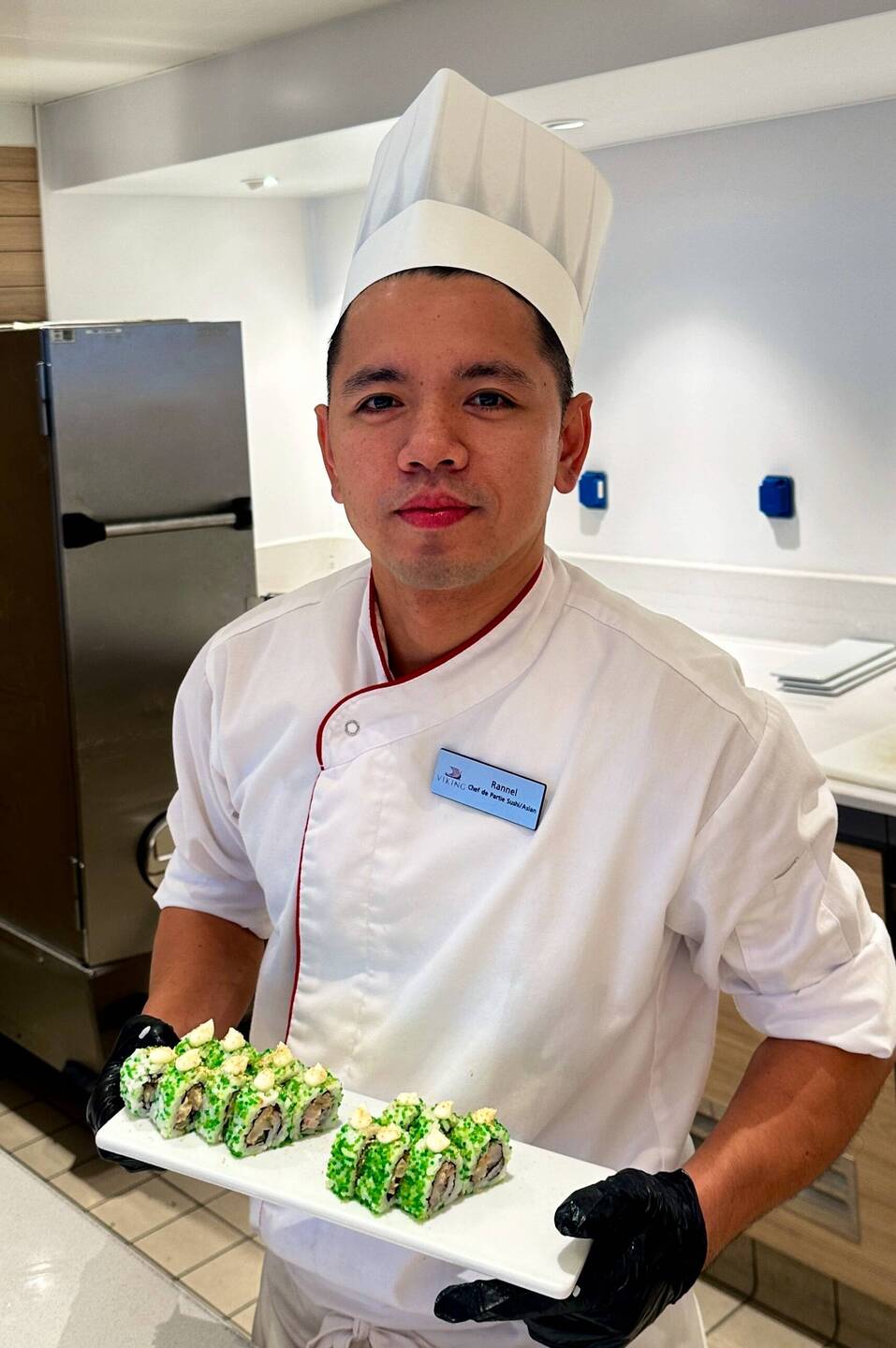 Sushi Chef: Rannel in the photo today. This is Rannel’s second contract with Viking. His story is started as a dishwasher in a restaurant and worked his way up to sushi chef, to owning his own sushi resturant “ZeusZayn MakiMono” in Manila, Phillipines (( I did a bit of research this might be a franchise of a larger Japanese chain - I might be wrong )). Rannel has been doing sushi for 18 years now. He has studied the art of making sushi even under master Japanese chefs.
