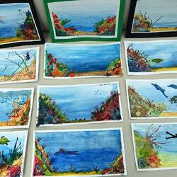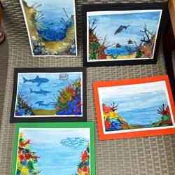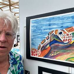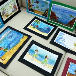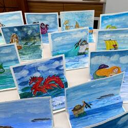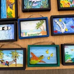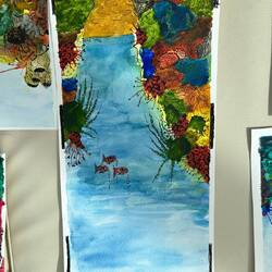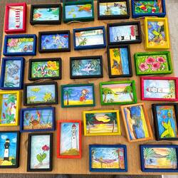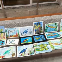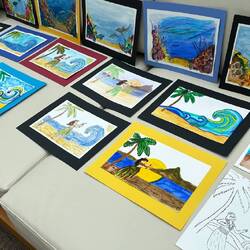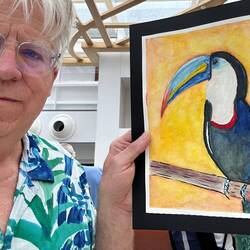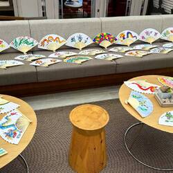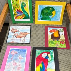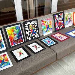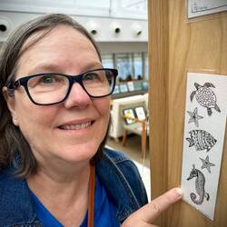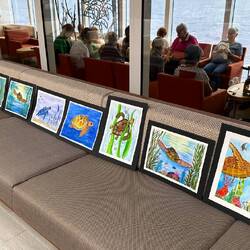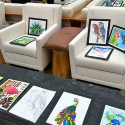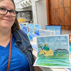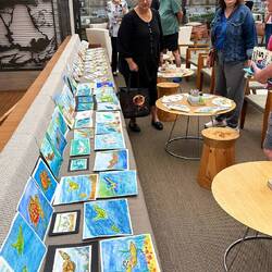 Today in the Wintergarden close to 500 pieces of art were on display. During sea days for the past few weeks, Deborah Ayres, an Australian artist led morning and afternoon groups through various art projects. Deborah is a gifted artist and teacher. She is able to work with everyone no matter their skill level. We all learned something. We all grew as artists.