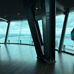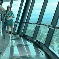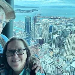 Donna had no problem on the helicopter ride over the Bay of Islands, but when she gets to the top of a tall building she has a bit of a nervous panic spell - she was all right - got her footing - even did a video walking over the glass floor.