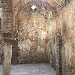 The first section of the Baths was the changing room (the al-bayt al-maslaj). It had a central pool about two and a half metres across, with a series of brick arches surrounding it. The pool itself was a drinking fountain, and not a bath as we might think. Around the edges of this room were wooden benches for chatting and socialising, and against the back wall a series of screens that formed changing rooms. There was also a cold room (al-bayt al-barid), where people could relax and cool down before entering the warm and hot rooms. Part of the tradition of these baths was to spend several hours here, and cleansing the body several times over.
