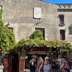 Following our morning of exploring and climbing and descending stairs in the Château and ramparts we were in need of sustenance. We went in search of a suitable restaurant for lunch and found one, Le Jardin du Carcasses. We had a wonderful three course fixed price lunch on the terrace. It was a really excellent meal, and very reasonably priced. We started with a tomato salad with ham. Ian and Brigitte had steak for main and I had grilled octopus, and we finished with ice-cream, chocolate mousse and crème brûlée. We then spent a bit more time meandering around the narrow streets.