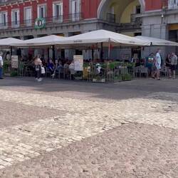 After unpacking we headed out to explore the area. We wandered through the Puerta del Sol square and then found our way to Plaza Mayor, which is a beautiful large square which, unfortunately, is partly obstructed by a large temporary building in the middle of the square due to a stamp trading fair having taken place and of course the requisite scaffolding as one of the buildings is cleaned/repaired. This did not take away from the vibe, with lots of people eating and drinking and, in some restaurants, bursting into song/chants. We’re not sure why. I will include a short video which captures one of these.