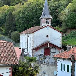 It was a lovely day weather wise and the Basque countryside was so lush and green and, as we were at the foot of the Pyrenees, a little steep at times. Our path went up and over what looked like a pretty steep hill, but in practice the road zig-zagged up the hill and, thankfully, we didn’t go over the highest part. The highest point of the walk was Col d’Oyhanzarre and after this it was all downhill. We passed through Lacarne, Bussunarits and passed by the Château d’Aphat. We met many pilgrims during this walk, including a Dutch couple who had been walking for about 6 weeks, a young guy who had come from Lourdes, and many others. We ran into Jerome parked by the road along the way, so we had lunch next to the bus in the shade. This was great, as we could leave our rubbish and anything else we didn’t need for the rest of the walk.