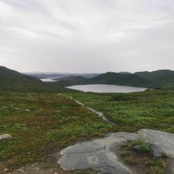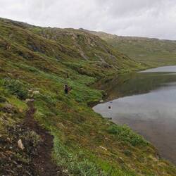 Die Nacht regnete es recht heftig durch und hörte dann gegen 8 Uhr auf. Wir hatten gestern Abend schon ein Zelt entdeckt und Damian traf dann auch kurz nach Verlassen unseres Zeltes Susanna aus Leipzig an, die sichtlich erleichtert war jemanden zu sehen. Sie hatte sich auf dem Weg verlaufen und es leider nur bis hierhin geschafft, obwohl sie ein Tag früher gestartet war. Wir entschieden deswegen erstmal zusammen loszulaufen. Die Schuhe zogen wir erst gar nicht an, sondern durchquerten direkt am Zeltplatz den ersten Fluss, über den man sonst wohl einfach drüber springen kann. Danach ging es dann mit den neuen wasserdichten Socken in unseren triefenden Wanderschuhen weiter. Das Wetter blieb zum Glück trocken und es kam sogar hin und wieder kurz die Sonne raus. Da war das Durchqueren der Sumpfflächen schon fast eine angenehme Abkühlung. Nach der ersten Steigung blieb Susanna zurück, da sie nicht so schnell hoch gehen konnte, aber wir wussten ja, dass es nur noch ca. 4km zur Hütte waren. Oben angekommen begrüßte uns ein sehr neugieriges Rentier und ein fantastischer Ausblick. Deswegen machten wir ebenfalls eine kurze Pause und ließen die Drohne zum ersten Mal fliegen. Nach etwas mehr als einer Stunden waren wir dann auch pünktlich zu Mittagszeit an der Katiffik Hütte, bei der bisher nur Jan saß, der schon morgens gegen 6 Uhr von der nächsten Hütte aus mit dem Kanu gestartet war. Wir trockneten unser Zelt, frühstücken erstmal ausgiebig und genossen das tolle Wetter. Es wurde dann mit der Zeit auch immer voller an der Hütte und die nächsten zwei Kanus kamen an. Darin saßen unter anderem Vivi und ihr Sohn. Ihren Mann hatten wir im Souveniershop am Flughafen getroffen und er erzählte uns, dass seine Frau und Sohn schon fast am Ende des Trails sind und er sie bald abholen wird. Danach kam dann Susanna, zwei weitere Dänen und noch zwei Deutsche an. Als wir schon im Zelt lagen dann noch eine Tschechin, die sich zu den Dänen in die Hütte gesellte. Ab halb 7 fing dann pünktlich (laut Wetterbericht) der Regen an, der uns wieder bis morgens gegen 8 Uhr begleitete.Read more