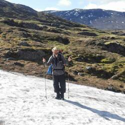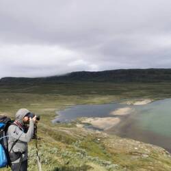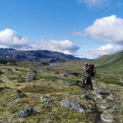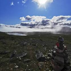 Ich wachte leider mit noch stärkeren Halsschmerzen auf, aber zumindest hatte sich Damians Magen etwas beruhigt. Wir machten uns gegen 6 Uhr langsam fertig, kamen aber erst gegen 7:40 Uhr los. Uns begrüßte eine wunderbar warme Sonne, die wir aber nach kurzer Zeit verfluchten, da wir den größten Anstieg direkt nach der Hütte vor uns hatten. Danach ging es im stetigen Auf und Ab zwischen mehreren Seen hindurch weiter. Wir mussten heute einige Flüsse durchqueren, aber konnten bei den meisten von Stein zu Stein hüpfen und mussten nicht durchwaten. Der Weg war deutlich angenehmer als gestern und wir mussten nur durch kurze Sumpfstellen stapfen. Für ca. 4 km ging es direkt am Seeufer entlang was wirklich sehr schön war. Dort machten wir eine kurze Pause und teilten uns einen Cliffbar und ein paar Nüsse. Nach dem See erwartete uns dann noch leider eine längere Feuchtwiese, die durch mehrere Flüsse gespeist wurde und wir sahen dort das erste noch vom Winter übrig gebliebene Eis. Die Wiese raubte uns wieder einiges an Kraft, aber wir motivierten uns gegenseitig, da die Hütte nicht mehr weit entfernt war. Nach 3 km sahen wir auch schon die erste kleinere und nach einem kurzen Weg entlang des nächsten See's die zweite Hütte, die auch direkt am See lag und unser Etappenziel war. Und das Beste - hier hatten wir unseren Pausentag eingeplant 😊. War auch bitter nötig, da meine Halsschmerzen sich so langsam in Husten umwandelten und der Pausentag somit genau richtig gelegen kam. Für die Etappe brauchten wie ca 7 Stunden und konnten so den Nachmittag sowie Abend in der Hütte ausklingen lassen. In der Hütte erwartete uns eine sehr nette dänische Familie, bestehend aus Vater, Tochter und Sohn. Sie hatten heute ihren Pausentag eingelegt und werden sich morgen weiter auf machen. Sie hatten den Trail vor 6 Jahren schon mal gemacht (da müssen die Kinder so um die 10-11 Jahre alt gewesen sein 🤯), aber hatten damals sehr trockene und sonnige Bedingungen gehabt. Dieses Mal war es auch für sie ganz schön anstrengend. Wir genießten noch das tolle Wetter, machten ein paar Drohnenaufnahmen und ich versuchte mit viel heißem Tee der ankommenden Erkältung entgegenzusteuern. Mein Highlight des Tages kam dann nach dem Abendessen, als uns der Vater einen ihrer Pfannkuchen anbot, die sich zum Nachtisch noch auf der mitgenommenen Pfanne gebacken hatten. Verfeinert mit ein wenig Tonys Schokolade war der einfach himmlisch. Wir blieben für unsere Verhältnisse recht lange auf und legten uns dann gegen 21:30 Uhr hin.Read more