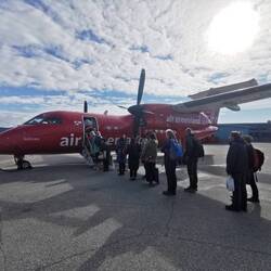 Anschließend ging es zurück zum Hotel und wir warteten auf unsere Flughafentransport. Der Flughafen ist so klein, dass es noch nicht einmal eine Sicherheitskontrolle gibt. Der neue Flughafen, dessen Terminal man von weitem schon erblicken konnte, wird 2025 wohl in Betrieb gehen und dann direkt von Kopenhagen angesteuert werden können. In der kleinen knuffigen Air Greenland Maschine ging es dann für 1 Stunde zurück nach Kangerlussuaq, wo uns so ungemütlich Wetter wie vor zwei Wochen empfang. Aber zumindest regnete es nicht, wodurch wir trockenen Fußes zum Hostel laufen konnten. Vorher gab es noch eine kleine Enttäuschung - uns wurde der Pulled Muskox Burger wärmstens empfohlen, aber leider war der seit kurz vor unserer Ankunft ausverkauft :(. Vielleicht gibt es ihn morgen vor unserem nächsten Flug wieder.