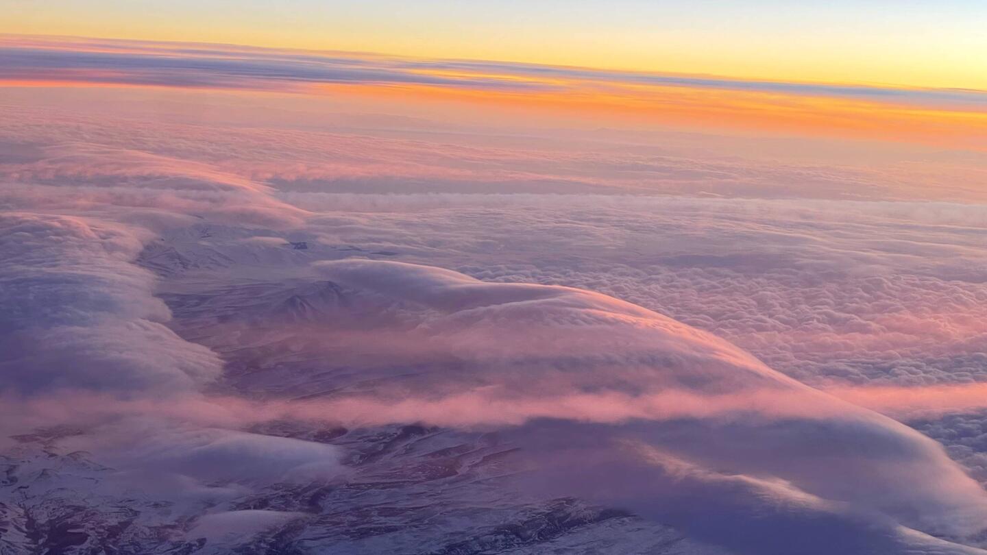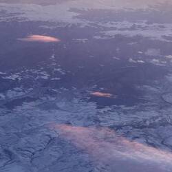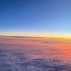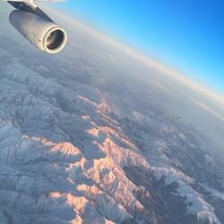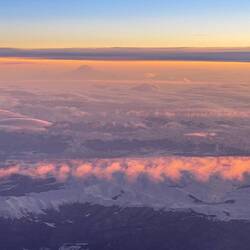 Als ich wach wurde, schaute ich nach draussen und unter uns erstreckte sich erneut eine wunderschöne Bergregion. Zuerst waren die Berge direkt unter uns zu sehen, dann sah man in der Ferne vermutlich einen grossen Vulkan, der insbesondere in der untergehende Sonne und zusammen mit dem tollen Vordergrund unter uns traumhaft aussah. Der Sonnenuntergang war unglaublich und ich konnte kaum wegsehen, bis die Stewardess mich bat, die Blende zu schliessen, damit die anderen Passagiere schlafen können.
