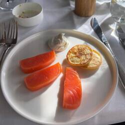 Das Essen konnten wir gemeinsam an einem Tisch essen, mit Blick nach draussen. Simi bekam einen riesigen Teller mit Trockenfleisch zur Vorspeise, für mich gab es Lachs mit Blinis und einen geräucherten Fisch mit etwas Kaviar. Ich wusste nicht, wie oder ob sowas schmeckt, aber es war ganz ok bzw. man hat den Kaviar nicht mal gemerkt.. Ich müsste es dennoch nicht mehr haben.. ich weiss nicht, weshalb Kaviar so gehypt wird..