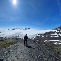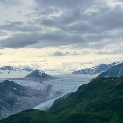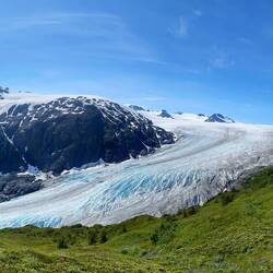 Wir assen gemütlich unser Spiegelei, tranken unseren Kaffee und fuhren dann los in Richtung Exit Glacier. Unterwegs hatten wir bereits eine super Aussicht auf den Gletscher, der sich noch bis ins Tal erstreckte.