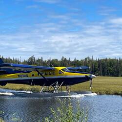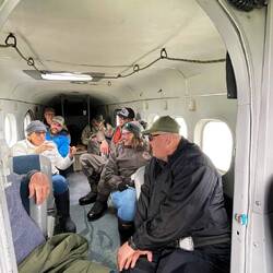 Beim Flugzeug angekommen gab es einen kurzen Schreckmoment, als wir alle einsteigen wollten. Ich hörte ein lautes Plätschern und dachte, „Mist, jetzt ist jemandem wohl tatsächlich der Rucksack in den See gefallen!“. Ich schaute hin und sah nur eine Mütze schwimmen. Merkwürdig, das konnte doch kein so lautes Platschen auslösen. Ein wenig später tauchte plötzlich ein Kopf im Wasser auf! Einer der Passagiere war beim Einsteigen in den See gefallen! Er sah ziemlich schockiert aus und kam kaum mehr aus dem Wasser. Als er merkte, dass grundsätzlich nichts passiert war, konnte er sich bereits wieder zu ein paar Spässen hinreissen und auch seine Kameraden hielten sich mit Sticheleien nicht zurück. Im Sinne von, „Hätte echt nicht gedacht, dass wir noch einen Belugawal sehen würden“. Der ältere Herr zog dann seine Fischerstiefel aus und goss mehrere Liter Wasser pro Fuss raus. Pitschnass kroch er dann ins Flugzeug. Ich wäre wohl erfroren.