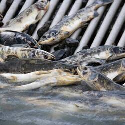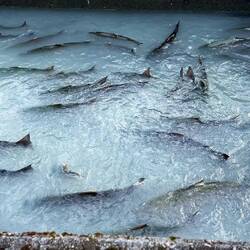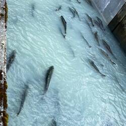 Wir spazierten noch den Weg rund um die Fabrik ab, wo man die gefangenen Lachse von nahem sieht. Im Gegensatz zu anderen Tieren hatte ich nicht soo ein schlechtes Gewissen, dass sie dort gefangen waren und dann zu Essen verarbeitet werden, denn sie würden so oder so sehr bald sterben. Lachse sind wirklich sehr dumme Tiere, wie wir mal feststellen mussten. Sie schwimmen einfach komme was wolle gegen den Strom, nur um dann elend zu ersticken, weil sie plötzlich in zu seichtem Wasser landen. Retten wollen sie sich auch nicht lassen…
