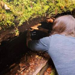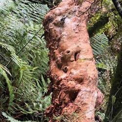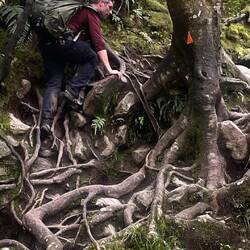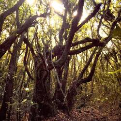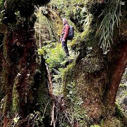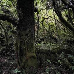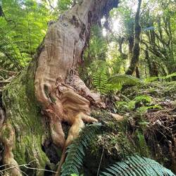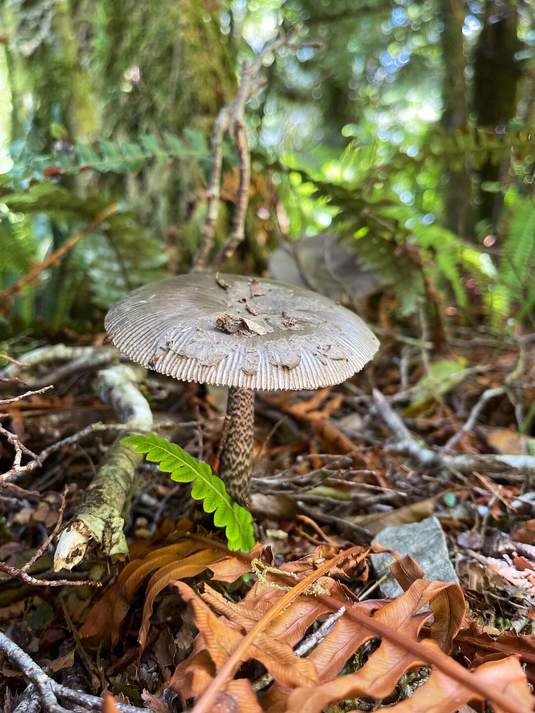 Irgendwann kam die Abzweigung zum Fluss, die wir auf der Karte gesehen hatten. Leider stand da ein grosses Schild, welches besagte, dass der Weg geschlossen sei. Wir ignorierten es zunächst, kehrten jedoch nach wenigen Metern freiwillig um. Es ging steil hinunter und wir wollten nichts riskieren. Im Weiteren stürmte es immer mehr. Auf dem Rückweg ächzten die Bäume im starken Wind, die Blätter rauschten nur so und es klang ziemlich bedrohlich. Kein Wunder passierten wir auf dem Weg dutzende, riesige alte Bäume, welche in der horizontalen Lagen..