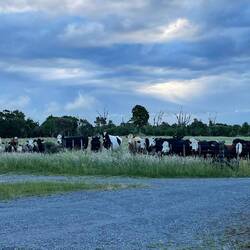 Vis à vis von unserem Camper befand sich eine weitere Kuhweide. Immer mehr Kühe standen direkt am Zaun und begutachteten uns. Hinter ihnen sah man immer mehr Kühe rennen, um sich noch einen guten Platz ganz vorne zu ergattern. Es sah wirklich, wirklich lustig aus. Am Ende standen wirklich alle Kühe da und glotzten uns fragend an.