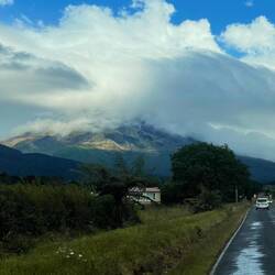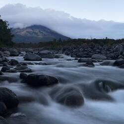 Nach dem erfolgreichen Einkauf fuhren wir zu einem Platz, wo man campen darf und wo wir uns erhofften, zum Fluss mit Blick auf den Vulkan zu gelangen. Es war ein derart stürmischer Tag, dass der Wind selbst die wirklich unglaublich dicke Wolkenschicht, die sich über die Region gelegt hatte, wegfegen konnte. Man konnte den Vulkan zumindest erahnen und die kleinen Berge nebenan wurden ebenfalls sichtbar und erstrahlten dank örtlichem Regenfall in einem tollen Licht mit ganz vielen „Layers“.