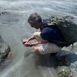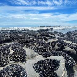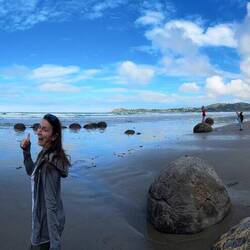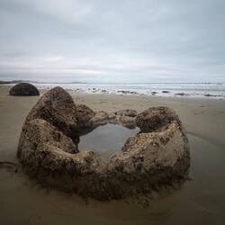 Nach dem Einkaufen und Essen fuhren wir noch zum Moutikieki Beach, wo gerade Ebbe war. Wir wollten dort nach Seesternen suchen und sie mit merkwürdigen Felsformationen im Hintergrund fotografieren. Die Uhrzeit war fotografisch gesehen natürlich nicht ideal, aber man muss die Ebbe nehmen, wenn sie da ist, sonst ist kein Foto möglich oder man wird vom Meer gefressen.