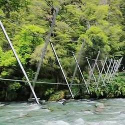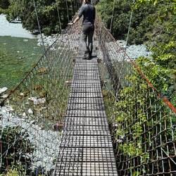Simi ging als erster. Er meisterte die wackelige Situation mit Bravour. Und ich meine, er HASST schon Hängebrücken, aber das Ungetüm hier besteht aus lediglich 3 Drähten, die alle paar Meter mit irgendwelchen V-förmigen Metallgestellen ergänzt sind. Unter der Brücke fliesst ein Fluss durch, der vermutlich seeehr kalt ist.