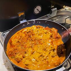 Das Wetter war immer noch gut und so freuten wir uns über einen Apéro draussen, dann wurde es kühler und wir gingen für die Vorspeise in den Camper. Fürs Abendessen nahmen wir dann das erste Mal den Grill hervor und grillten ein paar Spiesse, die wir temperaturbedingt dann wieder drinnen assen.