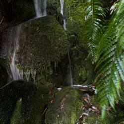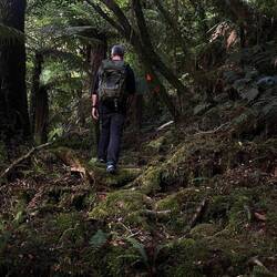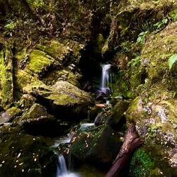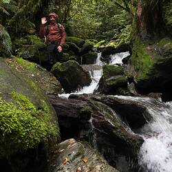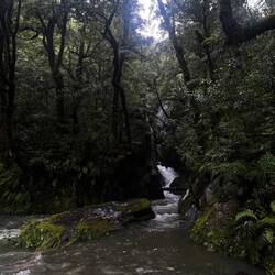 Wir wollten erst unser Vorhaben mit der Stadt nochmals in die Tat umsetzen, aber der Vulkan war immer noch zu sehen und so fuhren wir stattdessen zu den Dawson Falls. Der Parkplatz war supervoll, aber wir fanden irgendwann doch noch ein Plätzchen. Inzwischen war Regen aufgezogen und der Vulkan hüllte sich in seine übliche, dicke Wolkendecke.