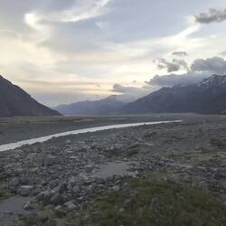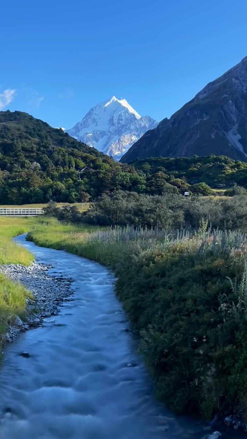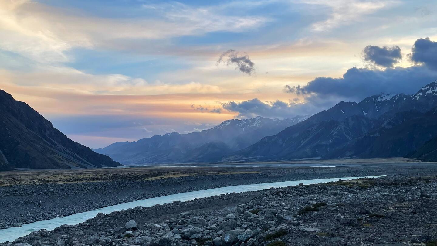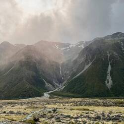 Der Himmel war nun strahlend blau, Mount Cook ragte in seiner vollen Pracht aus dem Boden, das viele Wasser von gestern war verschwunden. Wir fuhren los, die Bäche hatten alle wieder zu ihrem normalen Stand zurückgefunden.