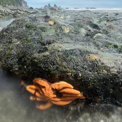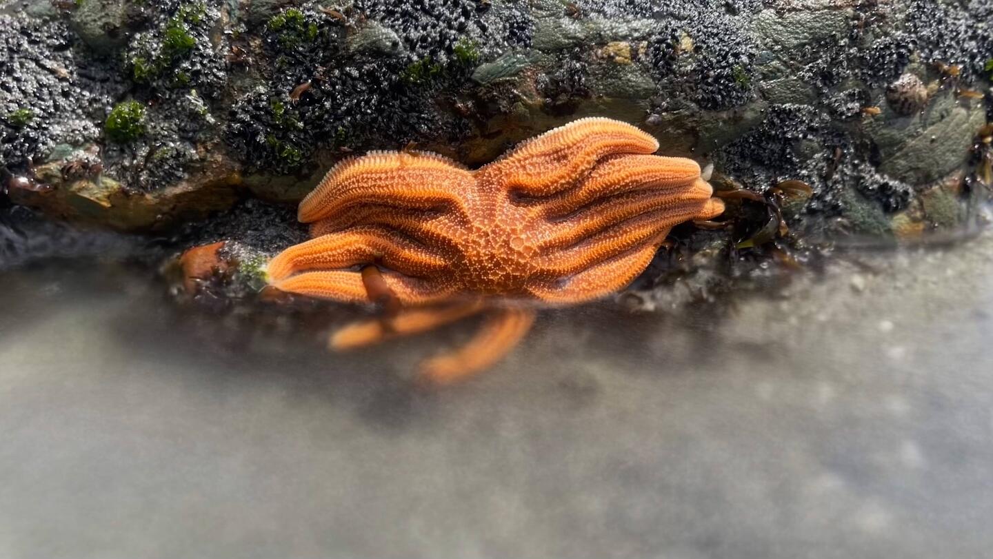 Wir liefen eine Weile dem Strand entlang und fanden wenigstens 2 orange Seesterne, die leider am falschen Ort waren, aber hey, wir haben sie gesehen und waren glücklich darüber. Bis ganz nach hinten zu den Felsen trauten wir uns nicht zu spazieren, weil wir wir nach dem Tiefpunkt der Ebbe angekommen waren und sie merklich zurückkam.