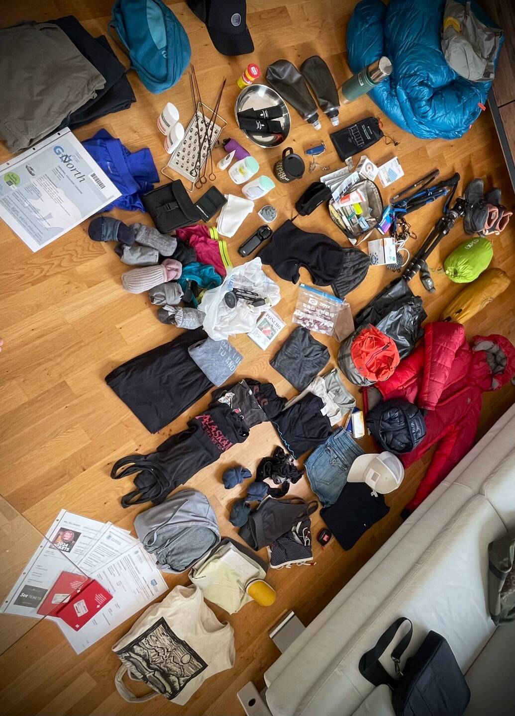 Mithilfe meiner Liste habe ich das nötige Gepäck zunächst hingelegt, um mir selbst meine Packliste bildlich zu präsentieren. So konnte ich auf einen Blick kontrollieren, ob auch wirklich jeder Punkt meiner Liste vor mir bereit liegt. Das Ganze wurde auch gleich fotografiert, damit ich, falls der Koffer mal wieder irgendwo anders hinreist als wir, gleich weiss, was ich denn diesmal alles verloren habe.