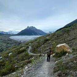 Irgendwann liefen wir auf einen kleinen Hügel und hofften, von da aus, gute Aussicht auf die Berge zu haben. Naja.. die Berge waren ok. Unsere Aufmerksamkeit wurde jedoch abgelenkt von einem ziemlich grossen Punkt, der hin- und herwatschelte. Ein Blick durch den Feldstecher bestätigte unsere Vermutung: Ein weiterer Bär! Und nicht einer der herzigen kleinen Schwarzbären. Nein, ein grosser, fetter Grizzly! Gottseidank war er in der Ferne und schien seinen Spaziergang auch eher in eine andere Richtung als in unsere fortzusetzen. Dennoch, wir waren mehrere Kilometer von unserem Camper entfernt. Wer weiss, ob wir unterwegs auch nochmals einen sehen würden? Auf dem Rückweg klammerte ich den Bärenspray umso mehr in meine Hände.