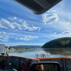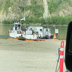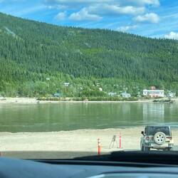 Die Weiterfahrt bis Dawson dauerte nochmals für immer. Nach ca 7h statt ca. 4.5h, wie von Google Maps anfänglich geschätzt, kamen wir bei einer Fähre an, welche uns über einen Fluss nach Dawson bringen sollte. Wieso eine Brücke bauen, wenn man auch eine teure Fähre (für Nutzer kostenlos) betreiben kann? Dawson, die Goldgräberstadt (auch bekannt aus einer Folge von die drei ???) scheint es sich leisten zu können.