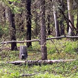 Wir hatten für für heute nicht viel vor. Einkaufen in Dawson City und dann ab nach Tombstone. Wir genehmigten uns einen Kaffee, füllten unsere Wasserkanister auf, machten einen kurzen Spaziergang auf dem Campingplatz, nur um rauszufinden, dass der Bieberbau weggeschwemmt worden war und fuhren dann nach Dawson. Unterwegs die super Überraschung. Vor uns lief „Smokey the Bear“ über die Strasse. Er sah genau so aus wie das Maskottchen, welches auf Waldbrände aufmerksam macht :-)