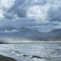 Wir fuhren bis zum See, wo unsere Reise gestartet hatte., allerdings nicht bis zu dem Platz, an welchem wir die erste Nacht verbracht hatten. Zuerst hielten wir, um die stürmische See und die Staubwolken am Horizont zu fotografieren. Es sah von Auge aus ziemlich eindrücklich aus. Fotografieren liess sich der Moment leider nicht wirklich.