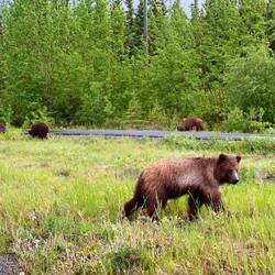 Wir fuhren den Highway entlang, als ich zwei neben der Strasse sah. Simi bog bei der nächsten Gelegenheit ab und da sah man einen Bären grasen (jep, richtig gelesen, ich wusste das auch nicht..). Ein anderes Auto stand da und wir beobachteten zusammen die inzwischen zwei Bären, bis sie im Wald verschwanden. Als wir danach umdrehen wollten, teilten uns die anderen beiden mit, dass sie sogar 4 Bären gesehen haben. Das machte uns natürlich etwas eifersüchtig. Als wir jedoch zurück in Richtung Strasse fuhren, sahen wir plötzlich auch 3 der 4 Bären und beobachteten sie eine Weile, irgendwann kam sogar noch der 4. Bär auch noch aus dem Wald heraus. Es war toll anzusehen. Aber es ist ein merkwürdiges Bild, wenn man 4 grosse Grizzly-Bären vor sich hat und sie frischfröhlich tonnenweise Blumen fressen, als wären sie Kühe..