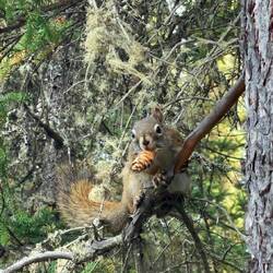 Nach dem freudigen Wiedersehen machten wir noch einen kurzen Spaziergang zum Fluss runter, weil ich dachte, dass man da vielleicht was Schönes sehen würde. Zig Eichhörnchen waren beschäftigt mit Tannzapfen-Futtern, aber ansonsten haben wir keine Tiere gesehen. Ich hatte gehofft, am Fluss unten auf einen Bären zu stossen. Naja, wenigstens hatten wir nun Hunger.