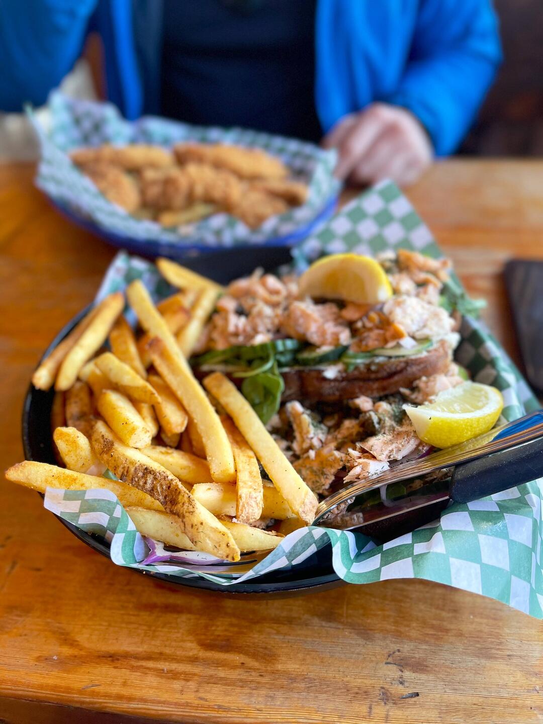 Wir waren hungrig und landeten in einem kleinen Restaurant, wo Simi sich Chicken Fingers und ich ein mit Arctic Char belegtes Brot (unabsichtlich mit Pommes) bestellte. Die Portion war gigantisch, aber es war leider sehr lecker.